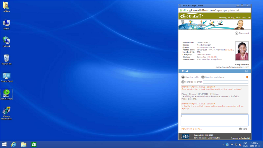 Features - Live Chat<< Back to Feature ListThis essentially can eliminate your customer service phone lines. Your customers can submit live chat requests through a queue (clicking the Live-Chat button on your web site embedded with an URL given to you by I'm OnCall). Your agents simply pick up requests and perform real-time live chat with the customers via the Internet. Your customers may leave call-back requests if the queue is busy.